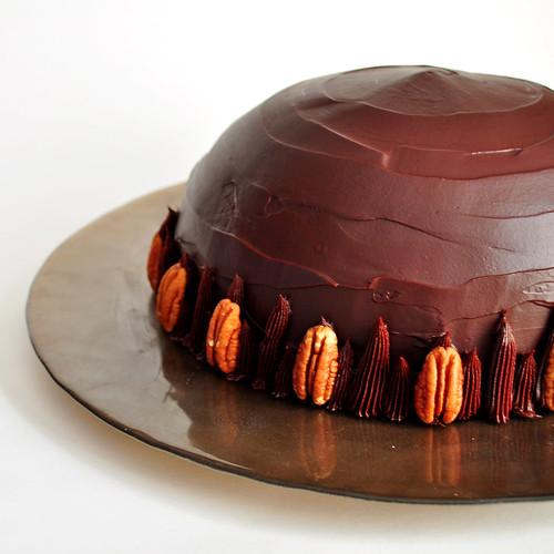 6. Melt the remaining 3 oz chocolate the same way as before, let it cool a bit and transfer to a large bowl. Add 2 cups of the chocolate mousse and the chopped pecans. Fold with a rubber spatula until combined and keep in the fridge until needed.